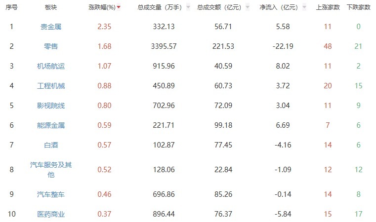 板块方面,贵金属、零卖、机场航运等板块涨幅居前,其他电源诱惑、元件、买卖等板块跌幅居前。